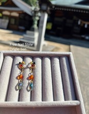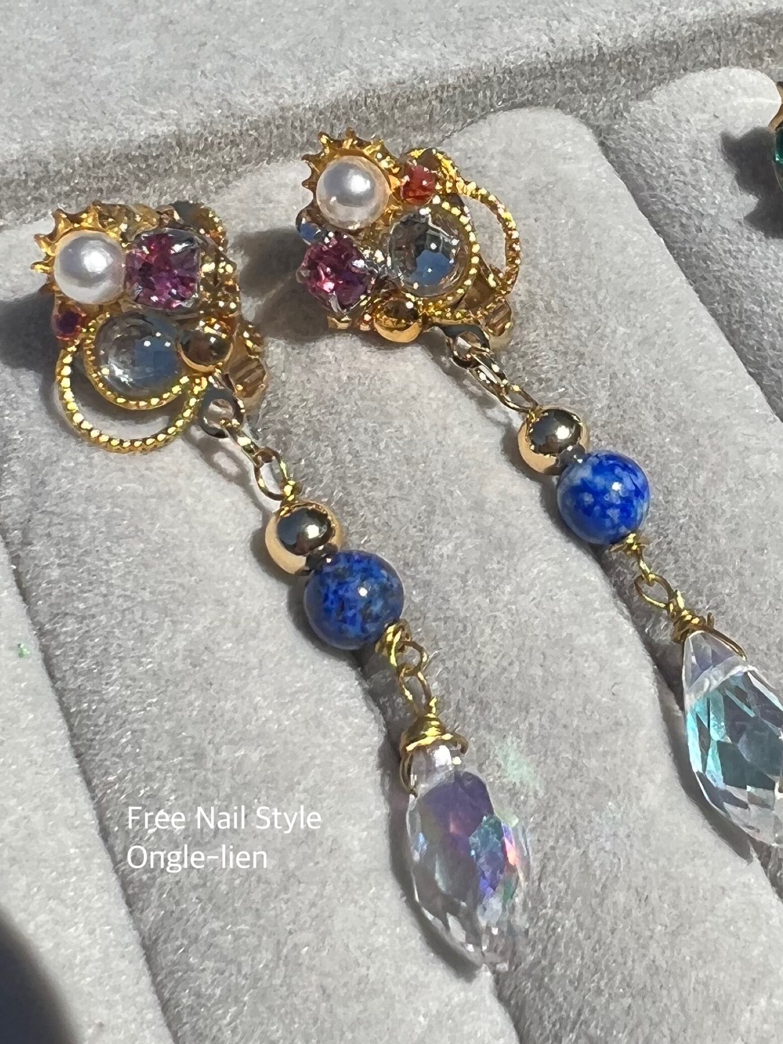 こちらはロングタイプの【イヤリング】です。パーツの色がゴールドとシルバーがお選びいただけます。パーツは全てオリジナルで組み合わせているのでそれぞれ違います。世界に一つだけの作品となります。